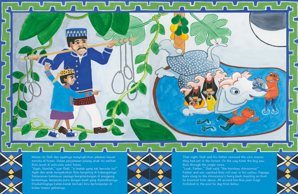 Children and adults will love this beautifully illustrated book, full of fascinating animals and colorful batik. They will feel a sense of pride in their very special rhinos and understand how important it is to protect those that are left.
