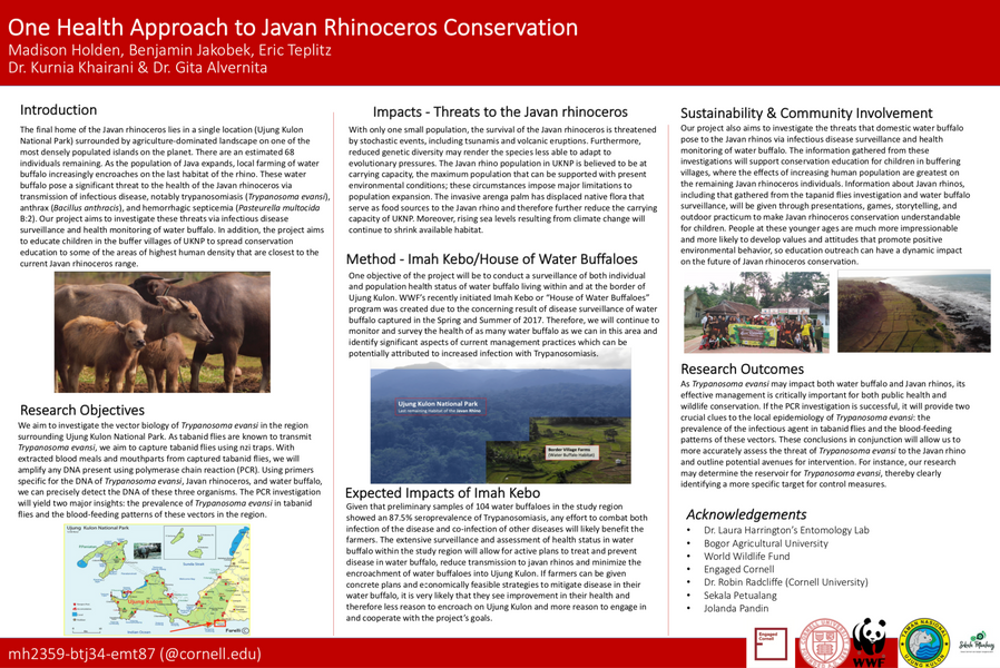 Given that preliminary samples of 104 water buffaloes in the study region showed an 87.5% seroprevalence of Trypanosomiasis, any effort to combat both infection of the disease and co-infection of other diseases will likely benefit the farmers. The extensive surveillance and assessment of health status in water buffalo within the study region will allow for active plans to treat and prevent disease in water buffalo, reduce transmission to javan rhinos and minimize the encroachment of water buffaloes into Ujung Kulon.